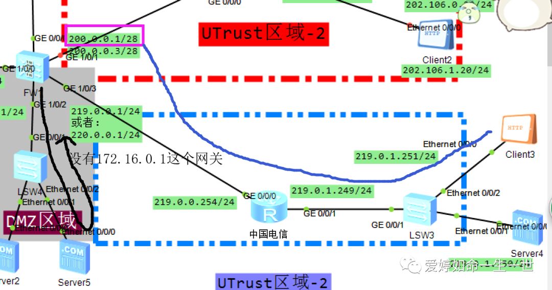 在企业的组网环境中,只有trust区域和Utrust区域,这种组网方式就比较简单。(P112书中详解场景)