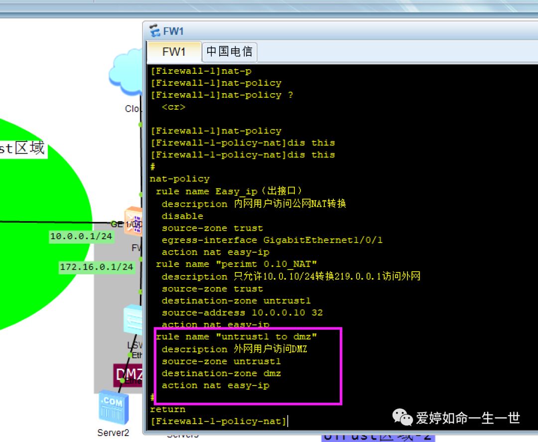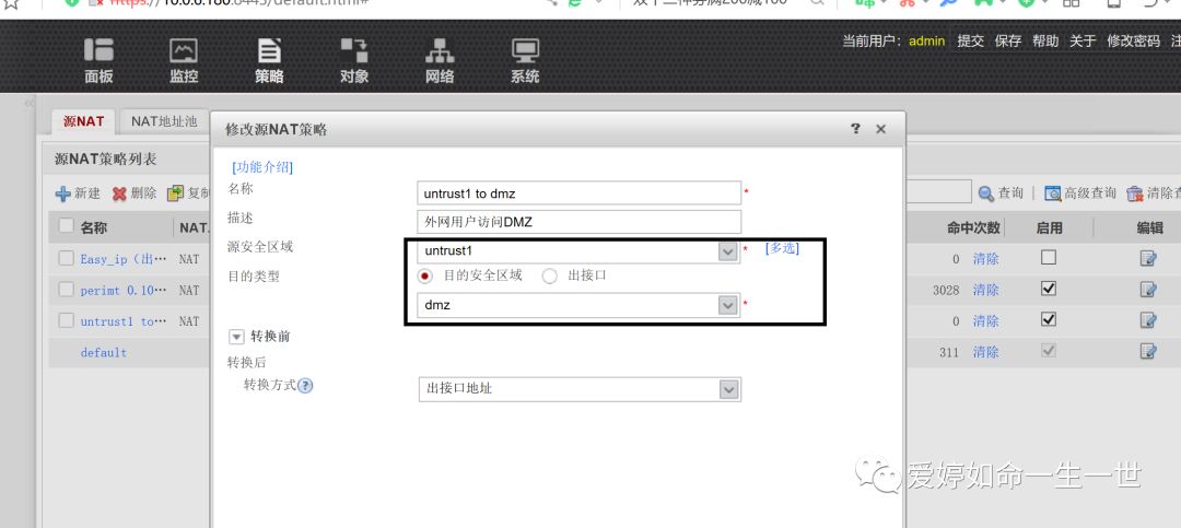 l来自untust1的报文去往dmz区域,转换成出接口的地址即可。