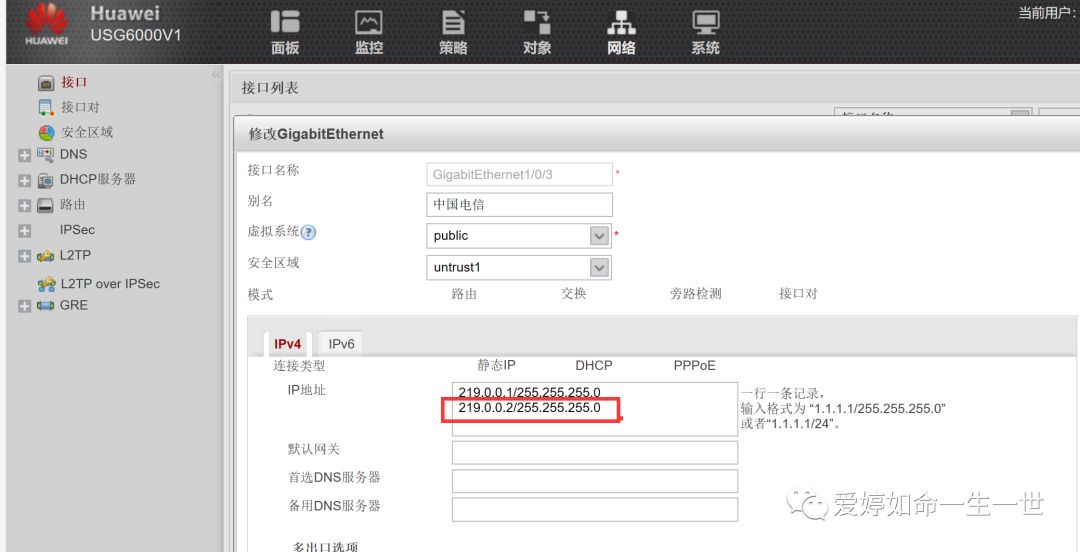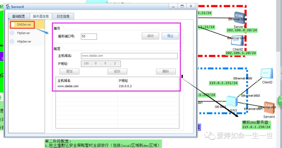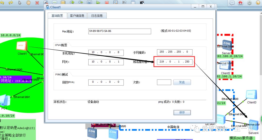 防火墙的G1/0/3接口中模拟申请一个219.0.0.2的公网地址,同时也增加一台DNS服务器,为的是更好模拟实际应用场景: