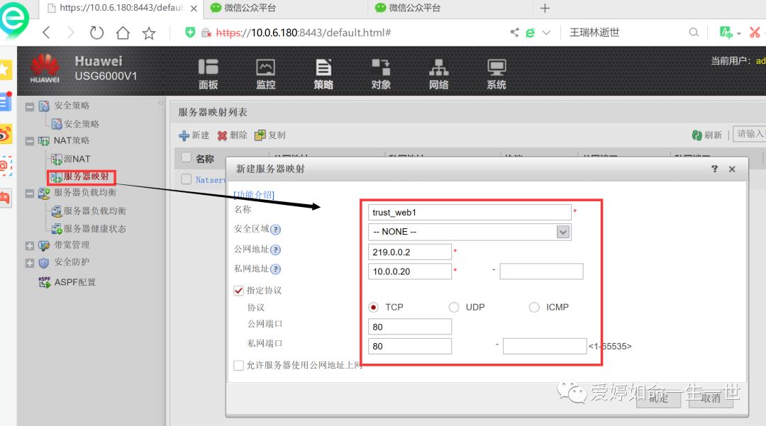 我先对dmz区域中的server5配置一条服务器一对一映射,将80口映射出去,而server5后续实验中取消网关,我们来看下实验结果,就能明白域间NAT的作用了