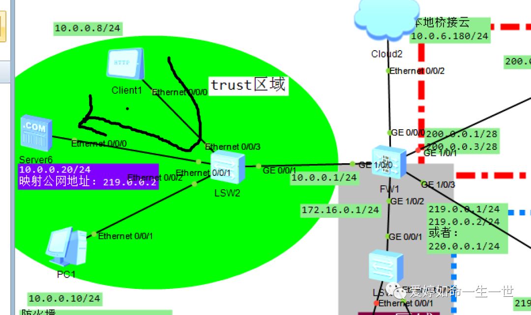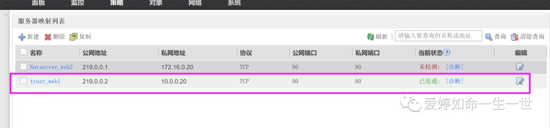 我先将trust区域中的一个服务器10.0.0.20映射给公网地址219.0.0.2