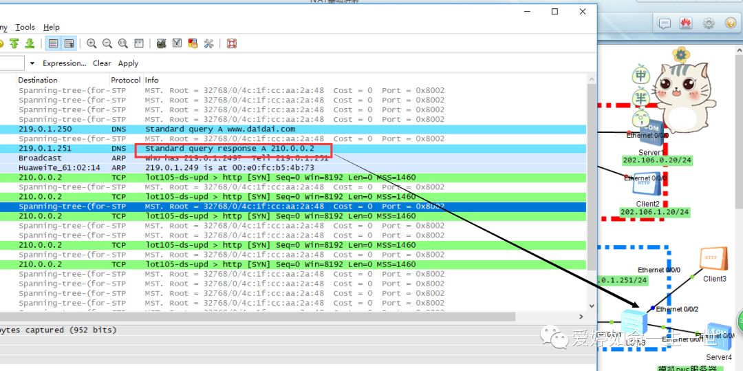 原因在于,server6回程路由的目标地址变了,通过抓取防火墙的g1/0/0接口,我们图中能看到,防火墙转出的报文将210.0.0.2转换成了10.0.0.20