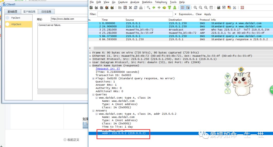 实验过程发现客户端不能正常访问,抓取报文得知自己的DNS解析地址出现错误。