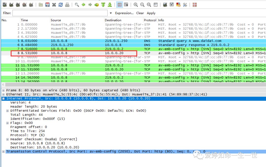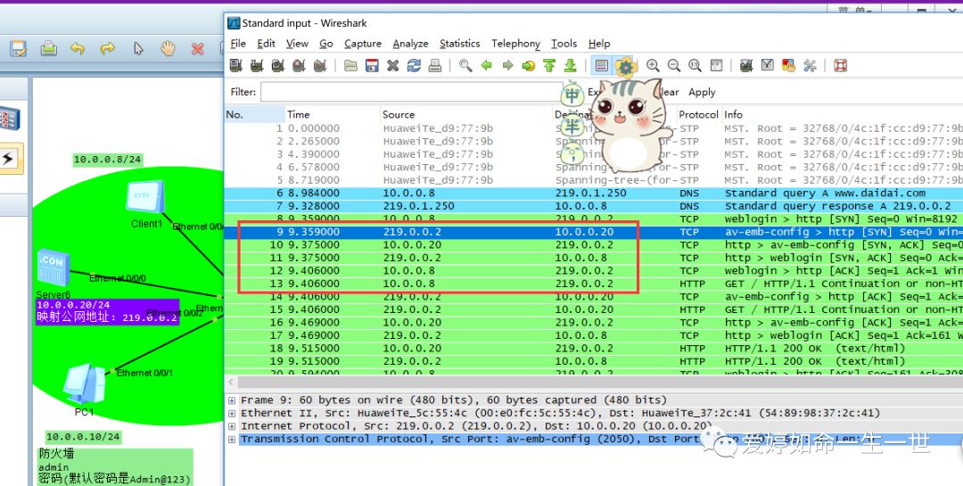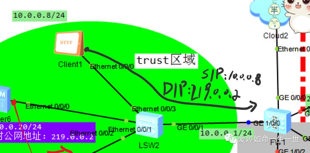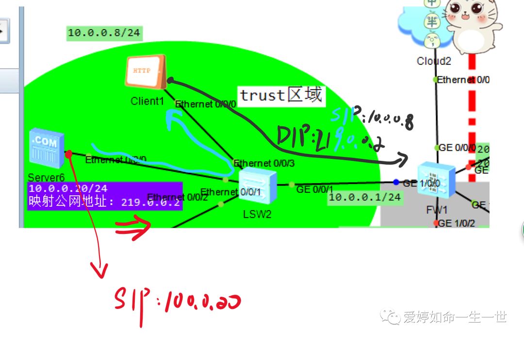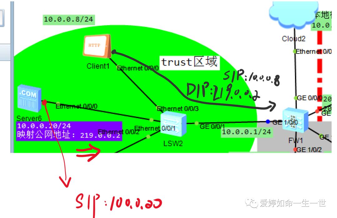 通过NAT server转换,会把目的地址(219.0.0.2)转换为10.0.0.20,而源地址是10.0.0.8,