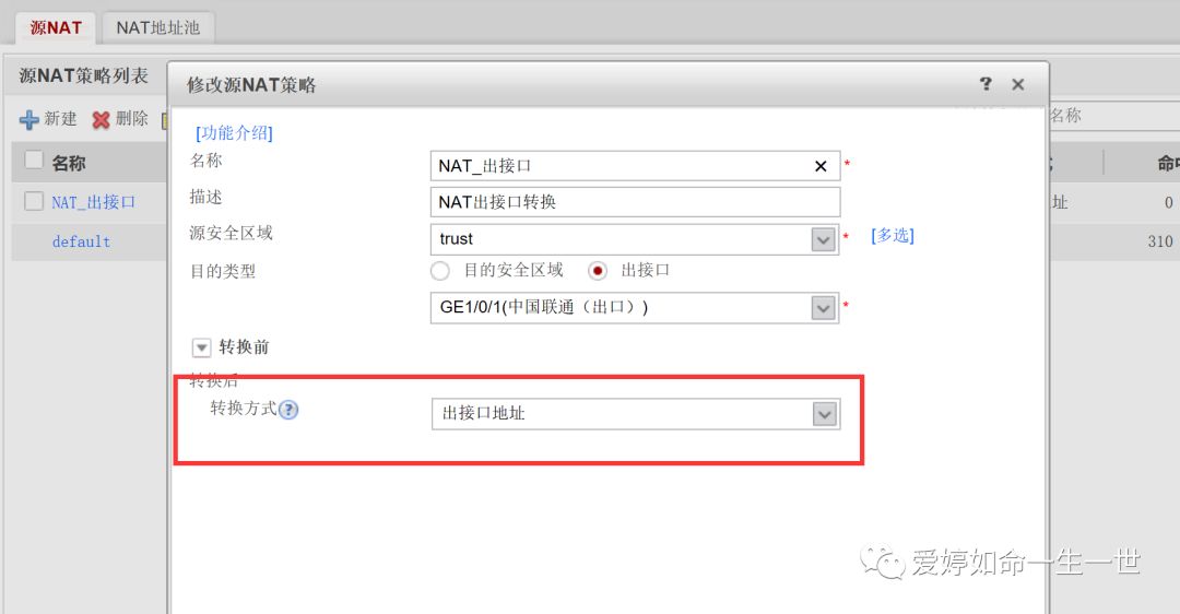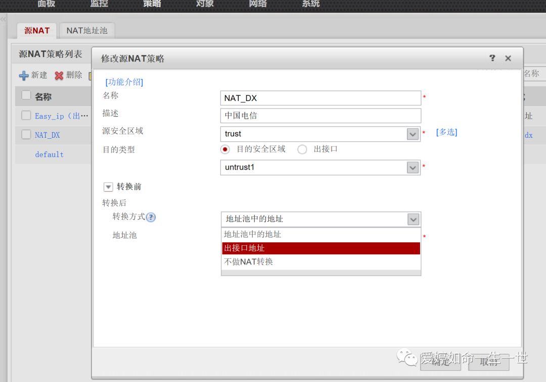上图中的允许端口地址转换为灰色不可选择,我们需要到源NAT策略中,将转换方式转为出接口方式,取消原有的地址池方式。