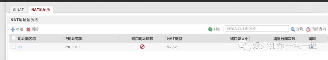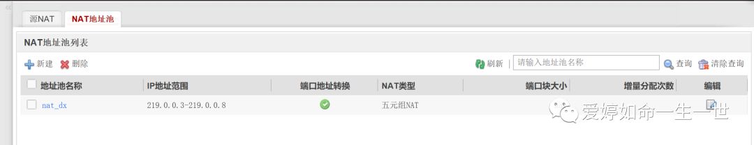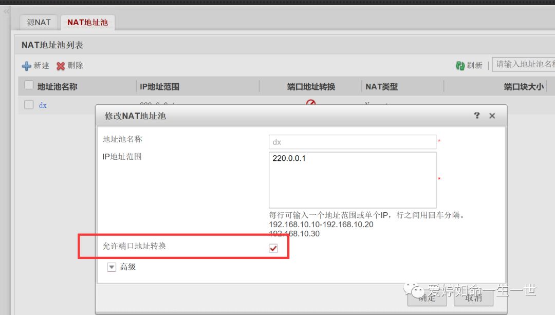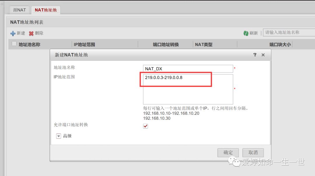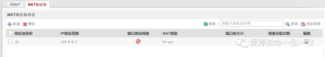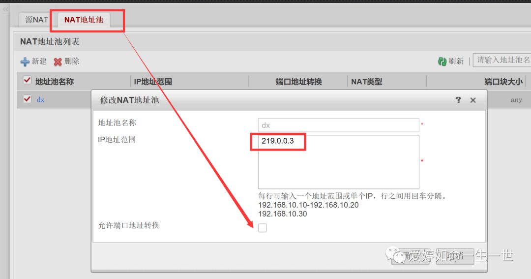到地址池中,我们定义一个地址池,并将允许端口转换状态去掉。并且地址池中的地址定义为一个219.0.0.3公网地址。