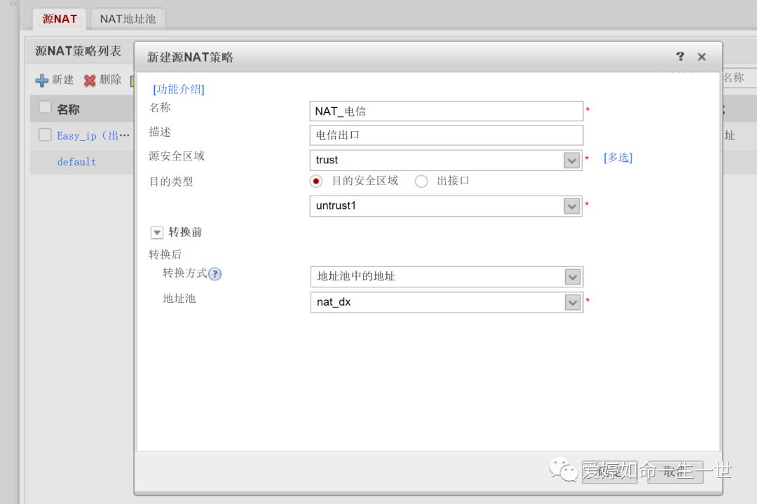 调用刚才建立好的地址池配置一条去往中国电信链路的源NAT策略: