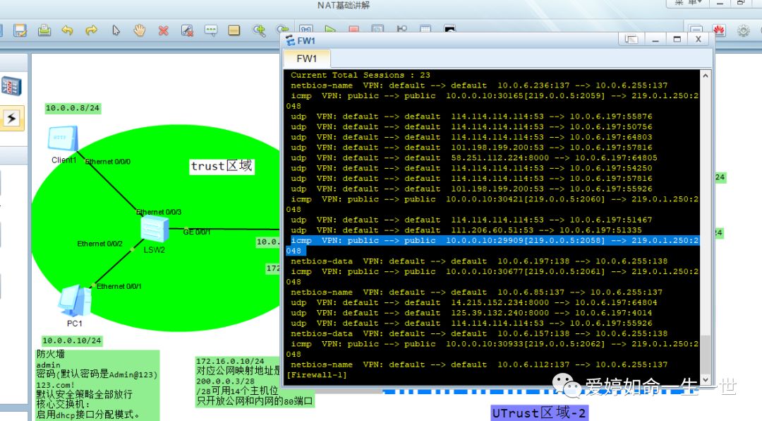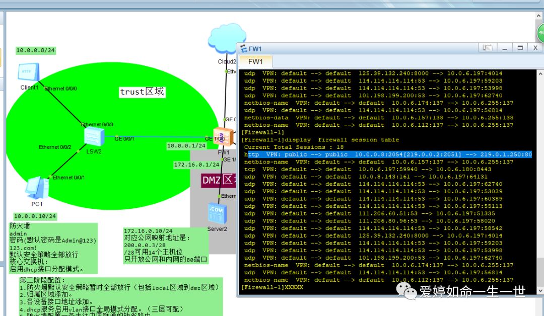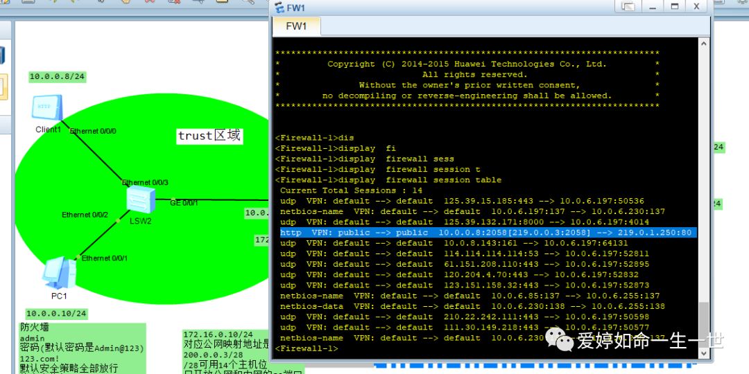 站在防火墙上用命令行查看会话表:观察NAT转换过程,