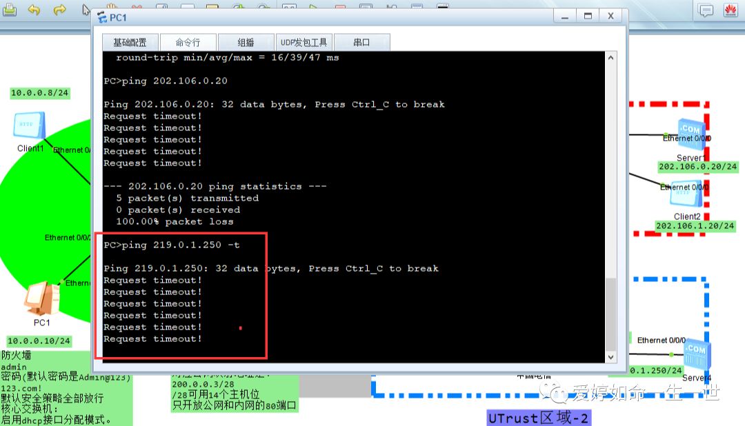 先来验证客户端是否能够和外网服务器通讯:如图所示,PC1是能够和外网服务器取得联系。