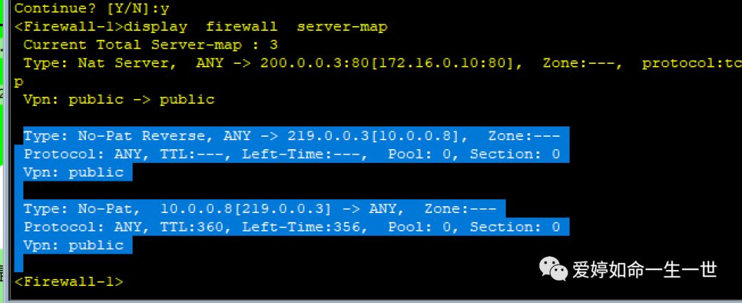 这里生成的正向Server map表作用是保护特定私网用户访问Internet时,可以快速转换地址,,因为转换方式为No-pat,一个私网用户就对应一个公网地址,那么在一段时间之内,私网用户在访问Internet报文,直接命中server-map表进行地址转换,提高了处理效率!同理,外网用户访问私网用户,也是直接命中servermap表,值得注意的是,命中Server-mapbiao 之后,报文还要经过安全策略的检查,所以配置的时候一定要注意!