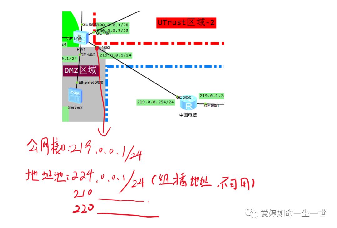 在企业的实际应用场景中,一个出口网关的实际接口IP地址可能和NAT地址池中的地址会配置两个不同网段的Ip 地址如图所示:我分配的一个地址和我接口上的地址是不在一个网段。我图中会分配一个210.0.0.1或者220.0.0.1的这个地址,反正就是与接口地址不在一个网段罢了。