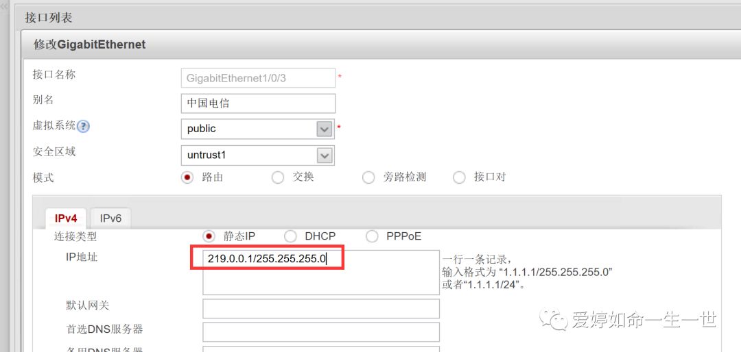 先在企业防火墙中的网络接口配置一个IP地址:(实际应用上镜中,防火墙的一个接口可以配置多个IP地址,这个IP地址一定是从运营商处合法申请而来的IP地址)这里,我就写一个地址。