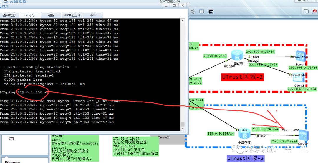 为了证明是随机分配的,我让图中的PC1去访问219.0.1.250.随之查看会话表,看看是不是分配给了地址池中的某个地址,如如所示,证明随机分配了地址池中的某个地址。