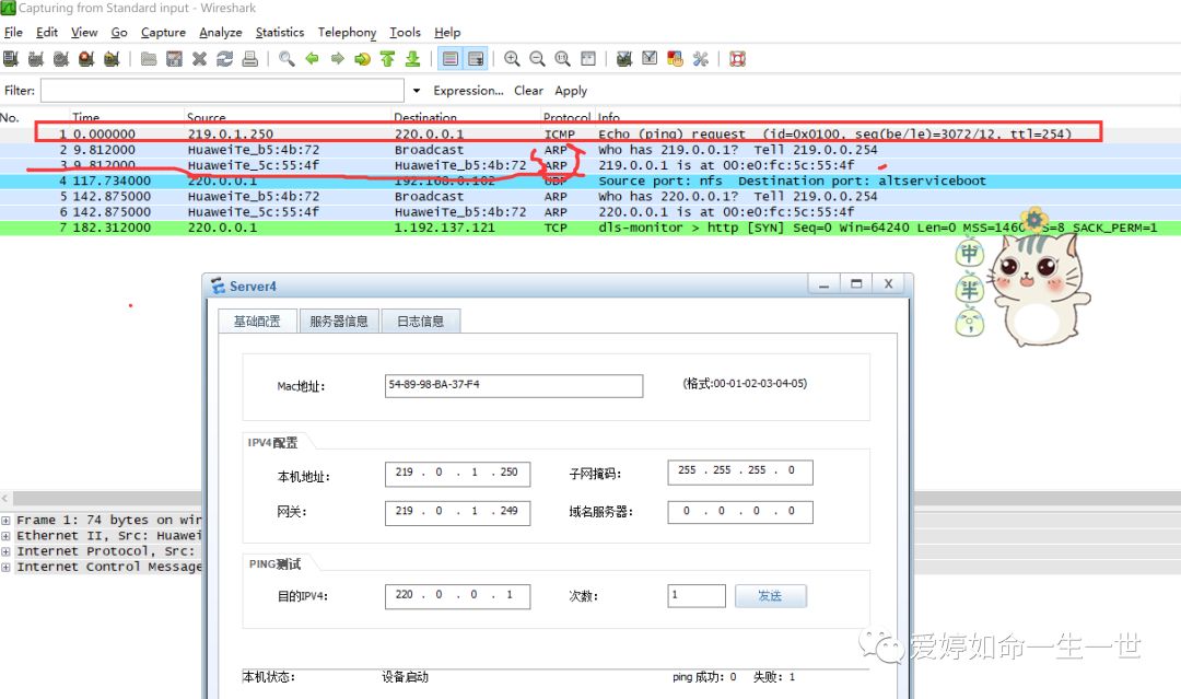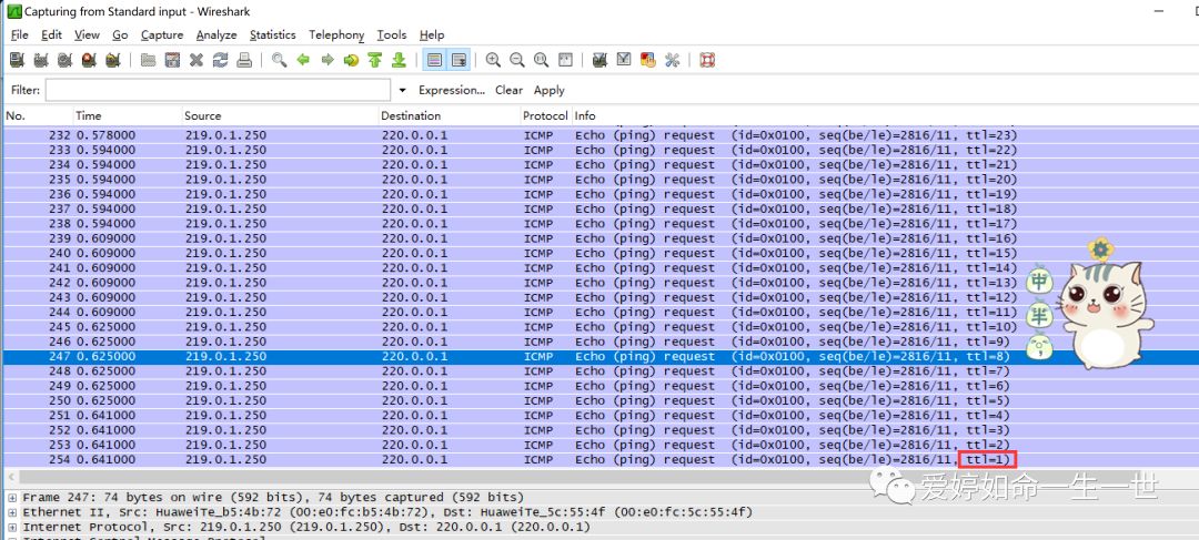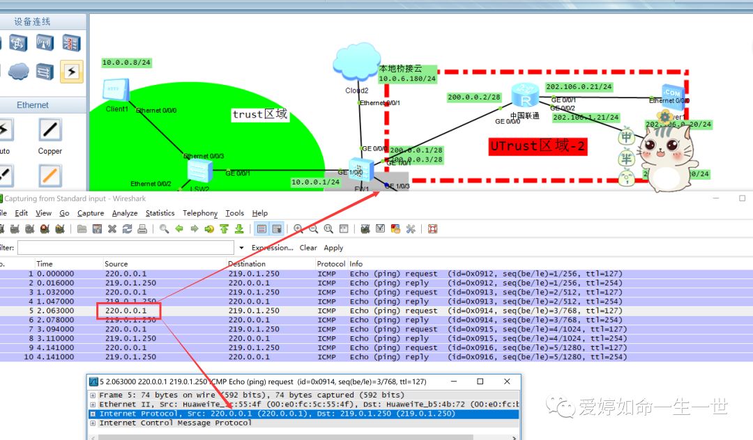 嗅探到的报文如下,如图所示,抓取到的ICMP报文中的源地址就编程了220.0.0.1这个地址,回程路由的源地址也是这个。因此,以认为在华为NAT转换中,转换的地址可以出接口的IP地址不在同一个网段之中!