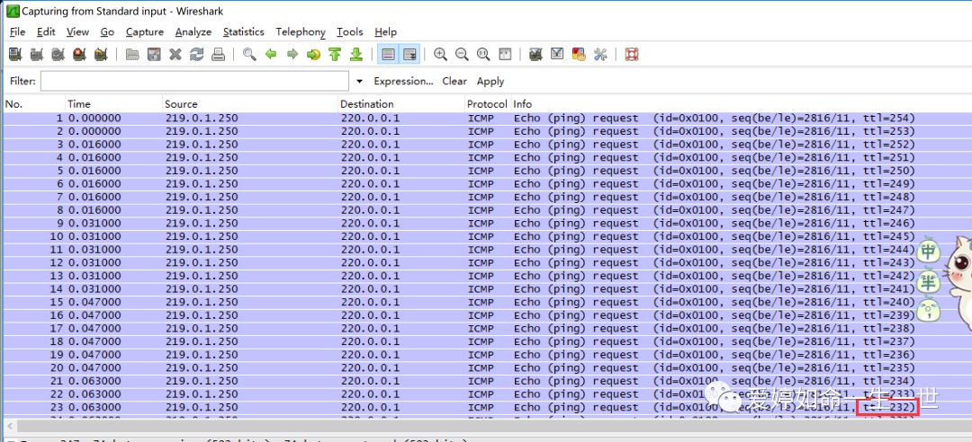 Ping的同时,我抓取防火墙的外网接口报文:真是不看不知道,一看吓一跳!来自外网的219.0.1.250这个用户就对着我这个220.0.0.1这个IP地址Ping了一次,如图所示: