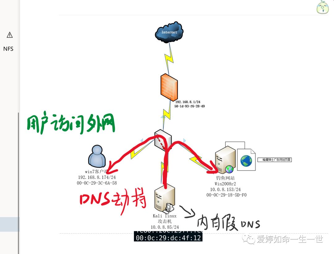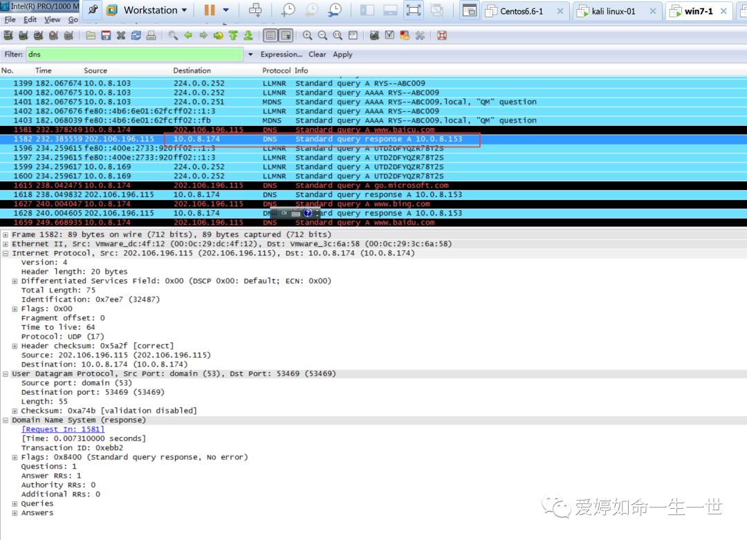 ②攻击者搭建假的DNS服务,并劫持客户端DNS请求,返给win7客户端一个假的dns记录,假的dns解析记录就是攻击者搭建的钓鱼网站。