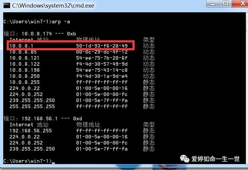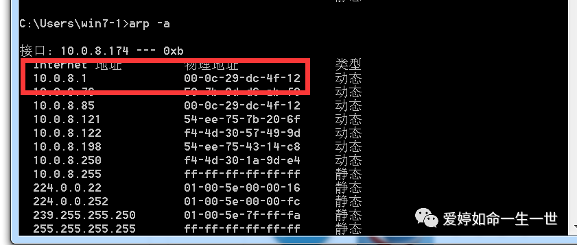 再次查看客户端ARP映射表的情况:发现网关的Mac地址表变成了 攻击机的mac地址。
