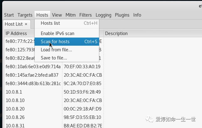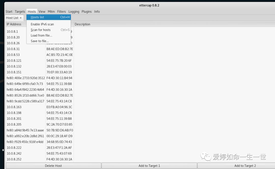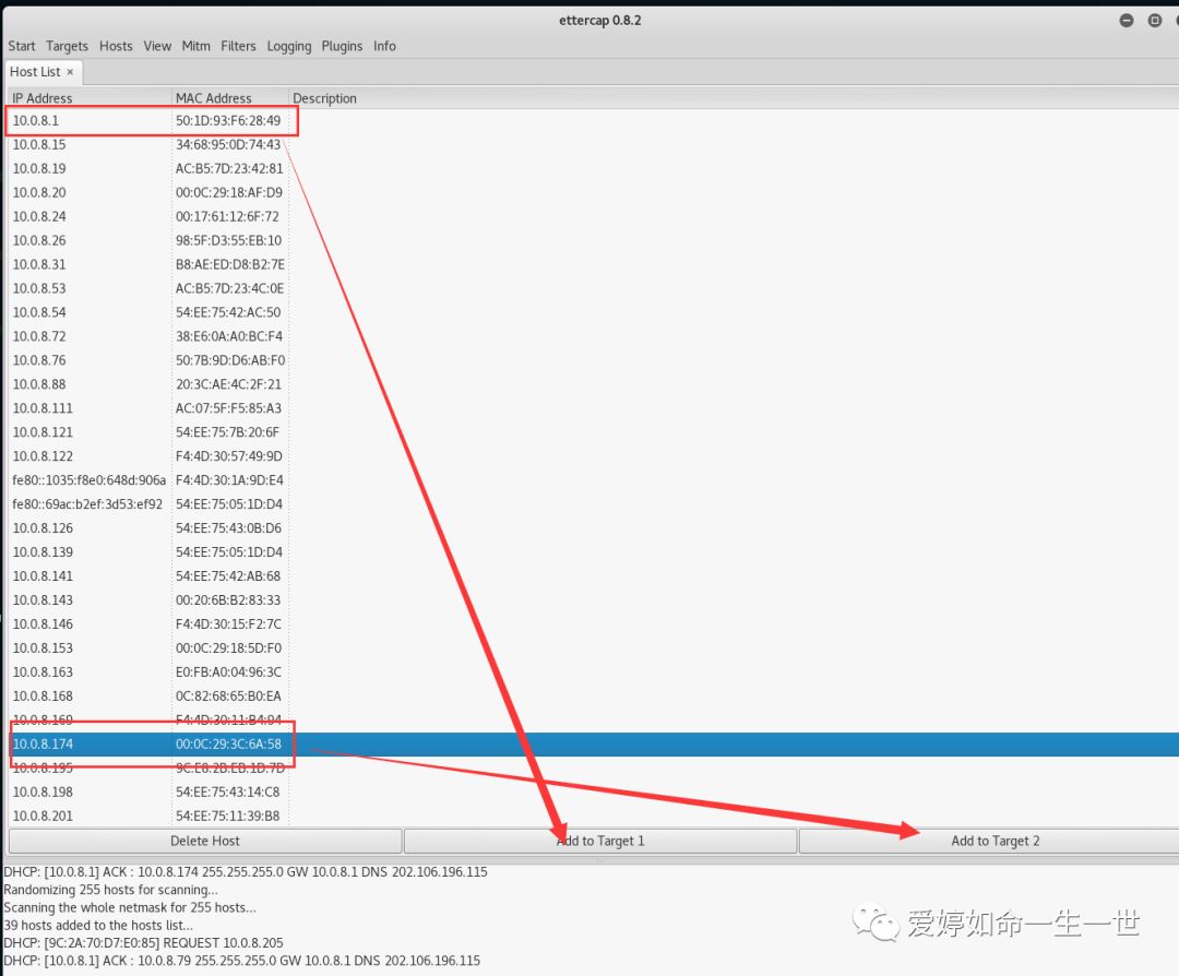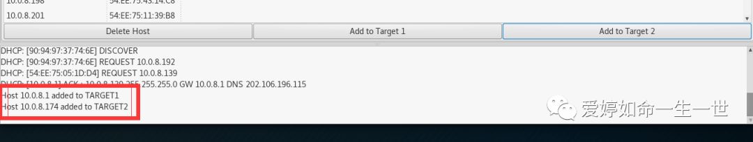 扫描结果:指定局域网中网关和win7-1客户端的Ip地址,如如所示:分别将网关和受害者的的IP地址加到目标标签中去: