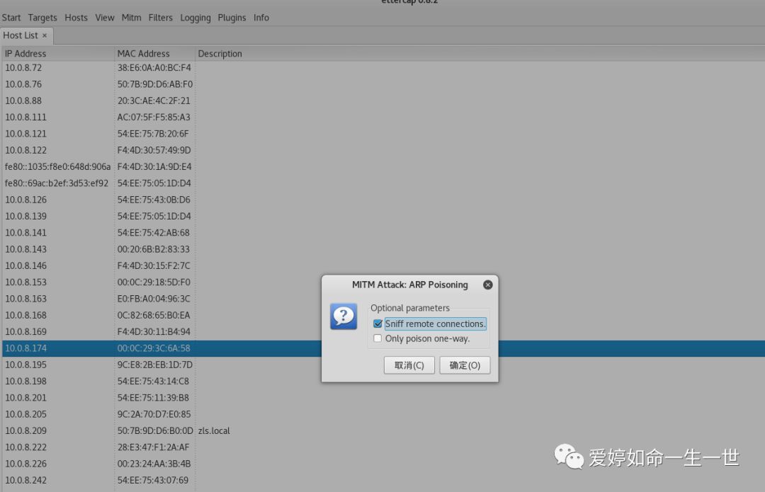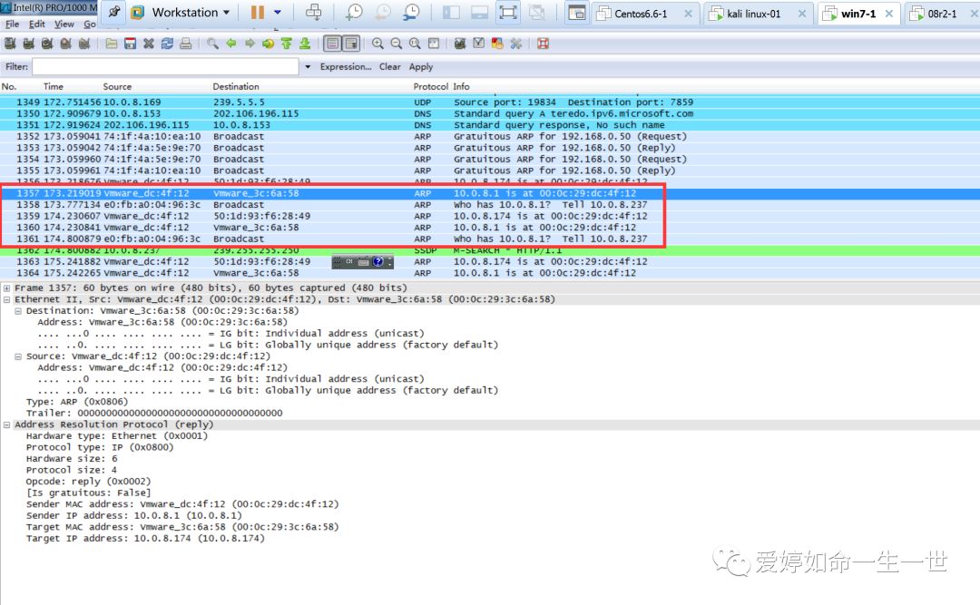 并且,站在受害机上,抓取到了ARP两头毒化报文:如如所示,告诉受害者网关地址是自己的Mac,又告诉网关,自己是8.174!形成ARP欺骗报文。这样的伪装真是防不胜防!