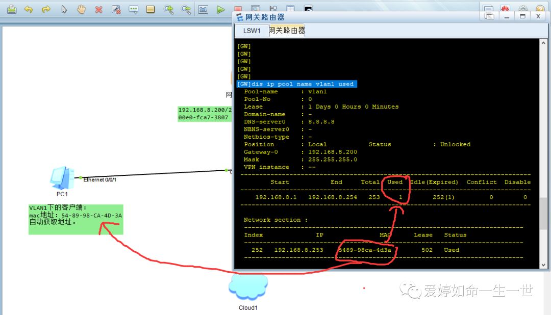 我们对照mac地址能很清楚的能够看到,192.168.8.253这个地址分配给了vlan1下的客户端。通常情况下,这个地址不会分配重复(根据源Mac地址来区分。)分配时间也会被记录在这张表中。