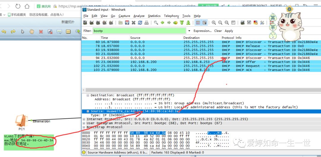 从图中看出DHCP的请求报文携带者vlan1客户端地址的源mac地址,目的mac地址为全F地址,典型的广播报文。那么既然是广播报文,交换机会无条件转发