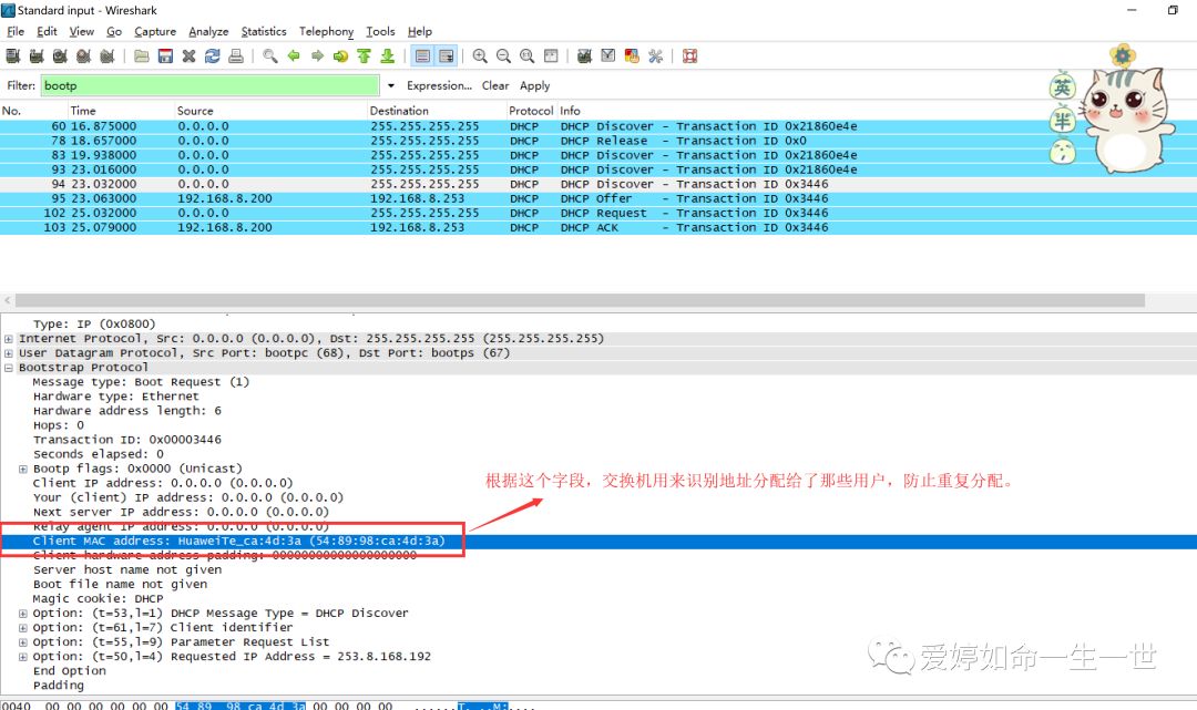 用wireshark软件嗅探DHCP报文,在众多的报文中用bootp命令筛选出dhcp报文,利于观察