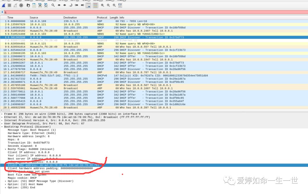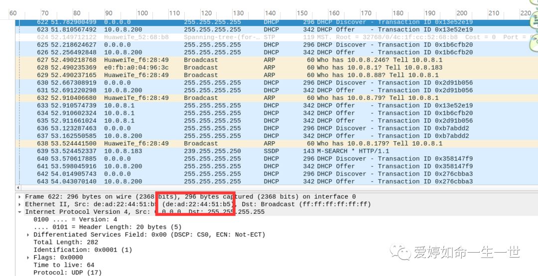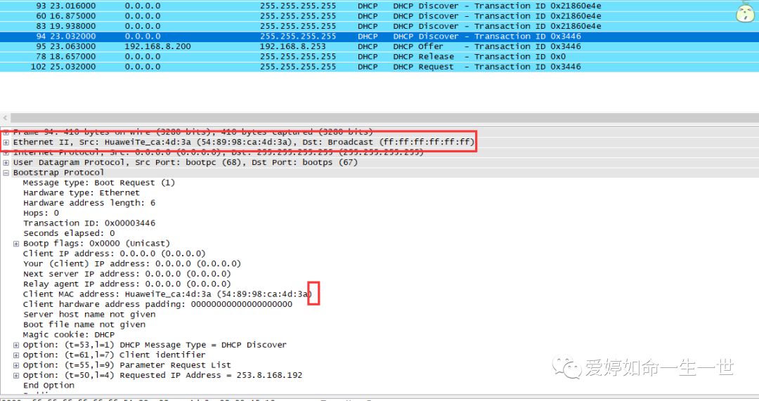 持续攻击的话,这个地址池就耗尽了。在后台随意抓取两个DHCP请求报文,发现DHCP的请求报文中里面携带者大量的随机的mac地址。