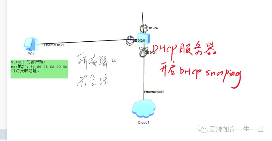 DHCP Snooping 功能一旦在交换设备中开启,如图所示:一旦开启snoping功能之后,只会在合法的接口提供DHCP服务,任何接口都不能提供DHCP服务功能,只要接收到DHCP报文就直接丢弃!