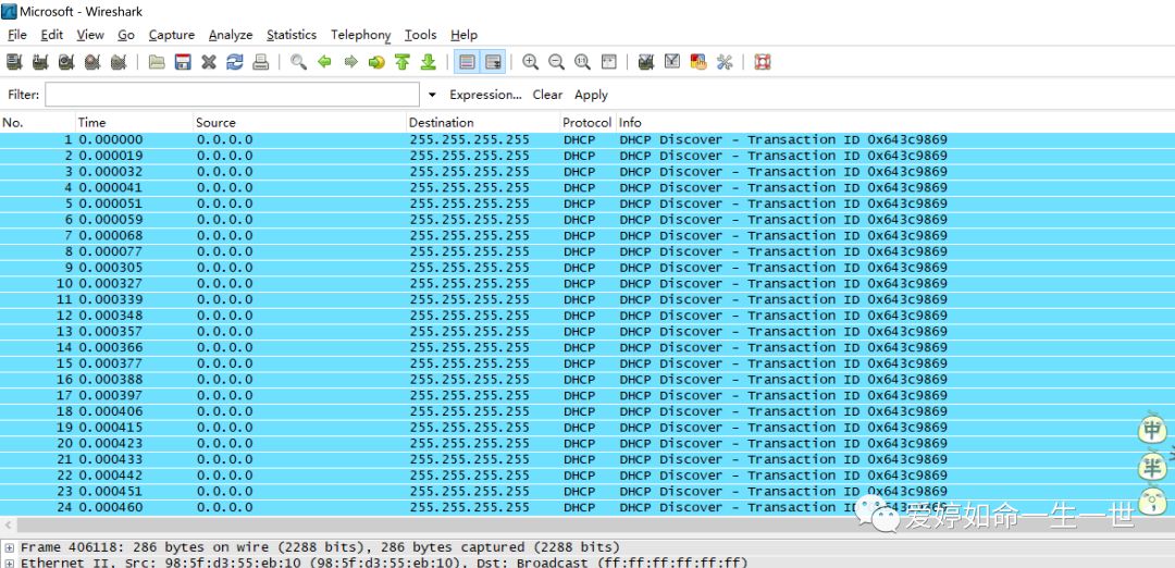 我们能够看到抓取的报文中短短1秒之内发送大量的dhcp请求,这样发送的频率真的是很恐怖!