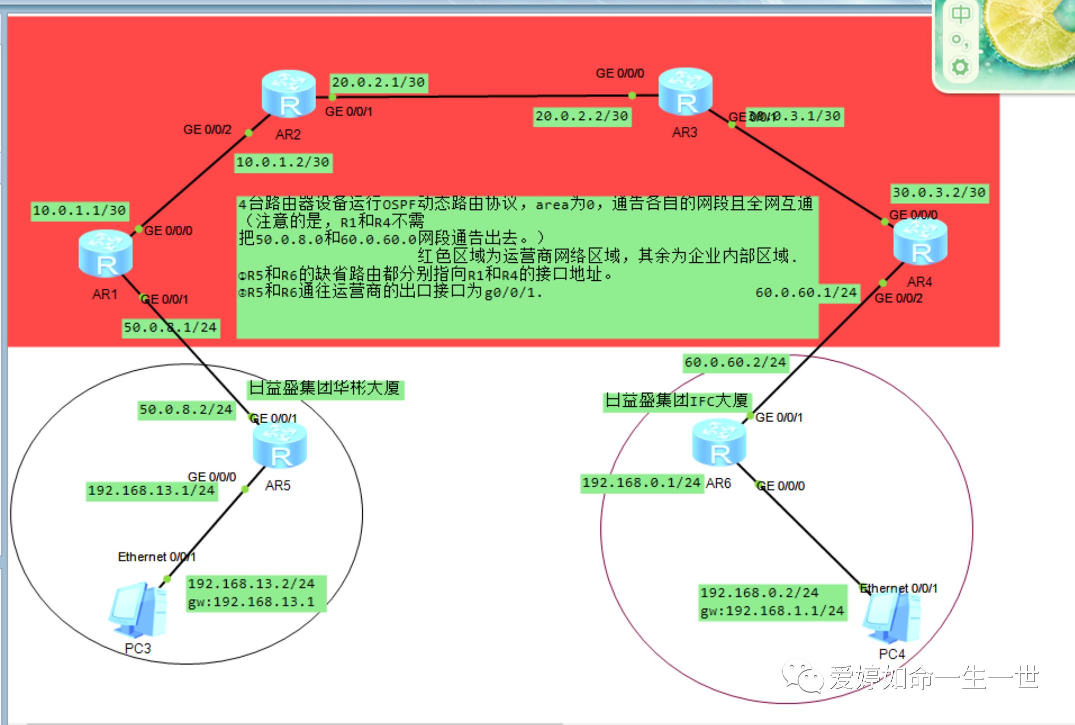 图中的红色区域代表运营商网络,期内路由设备运行OSPF动态路由协议,area为0,通告各自的网段且全网互通