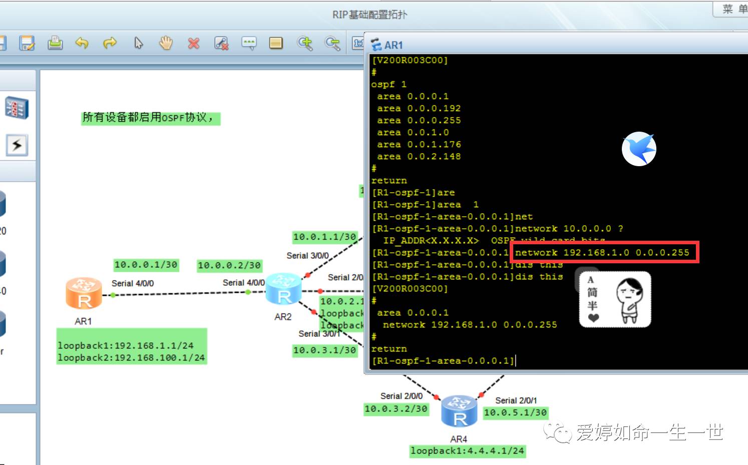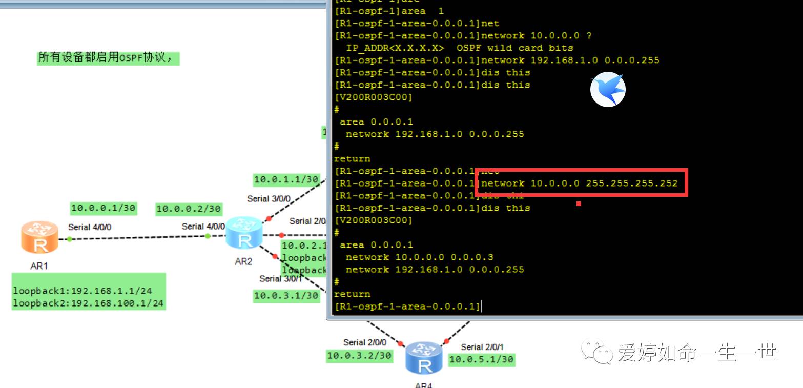 按照拓扑需求,我需要将lookback接口和相邻的网络进行使能OSPF,其中要注意反掩码书写。