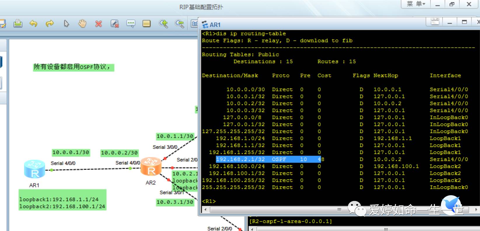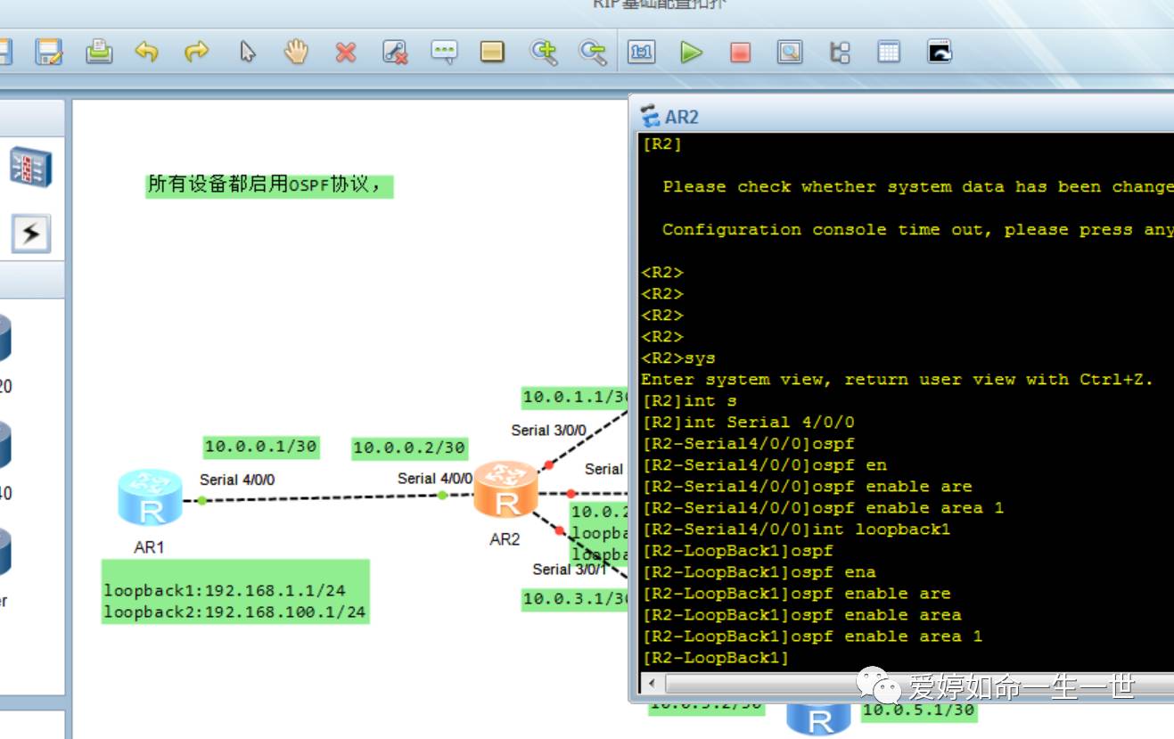 为了保证R1和R2互相能够通讯,我也需要在R2上的各网络上使能OSPF。