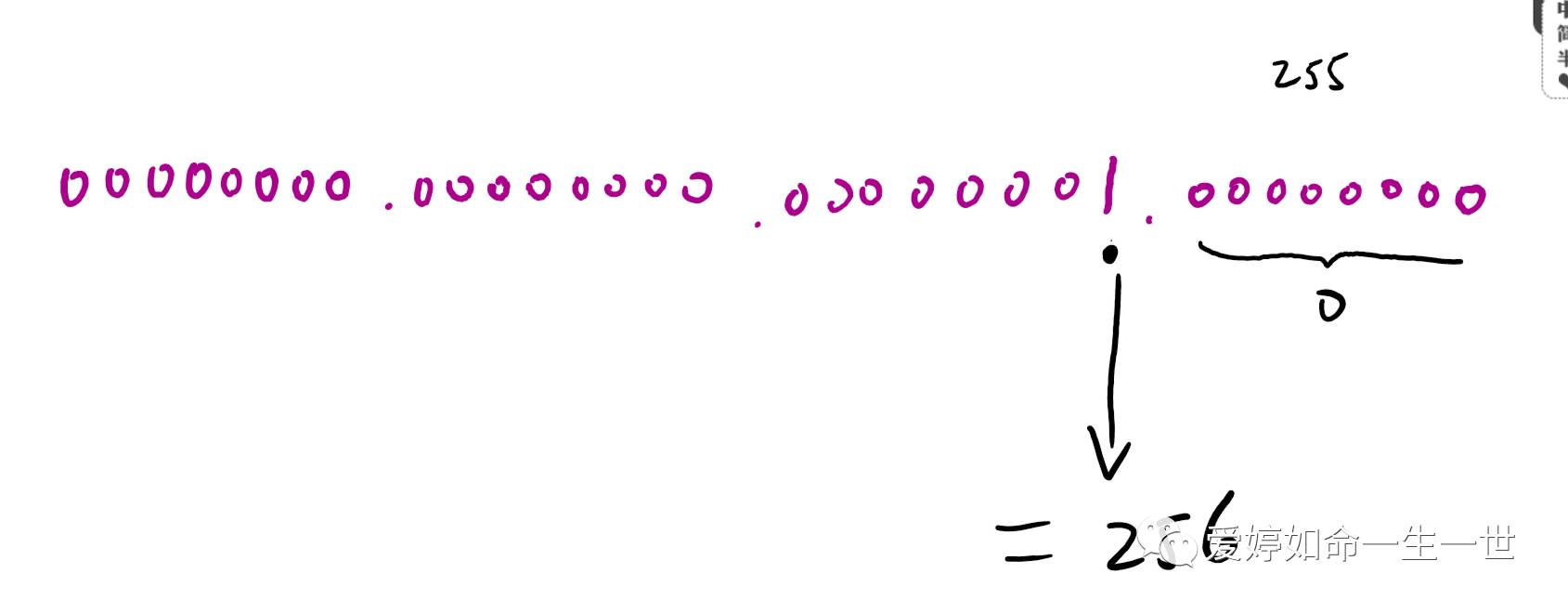 IPV4有4个字段,每个字段中有8个二进制数字组成,当我取值为256时,最后一个字段肯定爆满,为了表示256,它向前进一位的,具体转换如下00000000.00000000.00000001.00000000