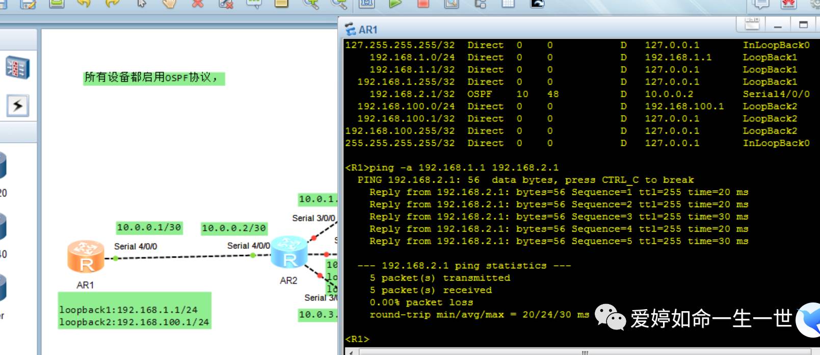 为了保证R1和R2互相能够通讯,我也需要在R2上的各网络上使能OSPF。
