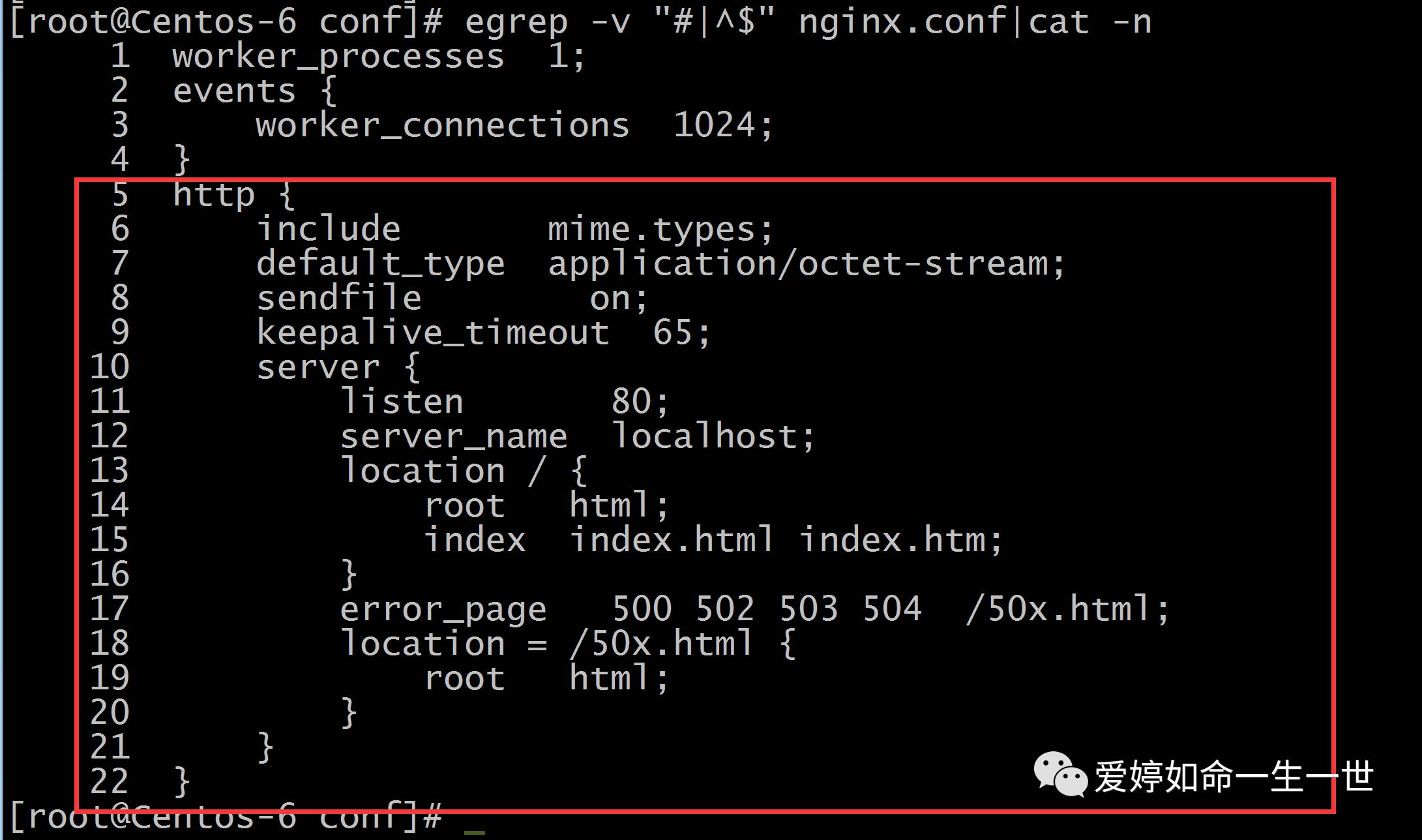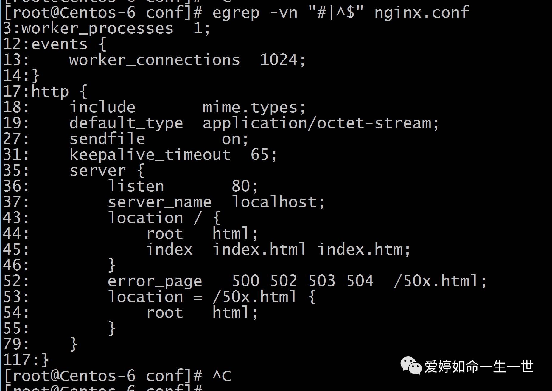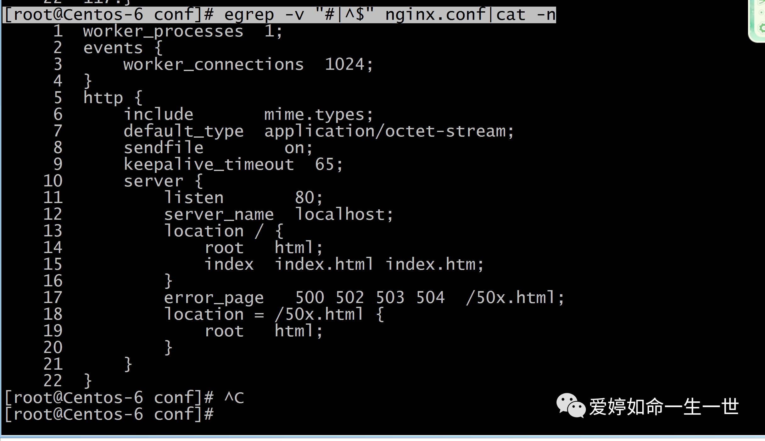 [root@Centos-6 conf]# egrep -v "#|^$" nginx.conf >n.log