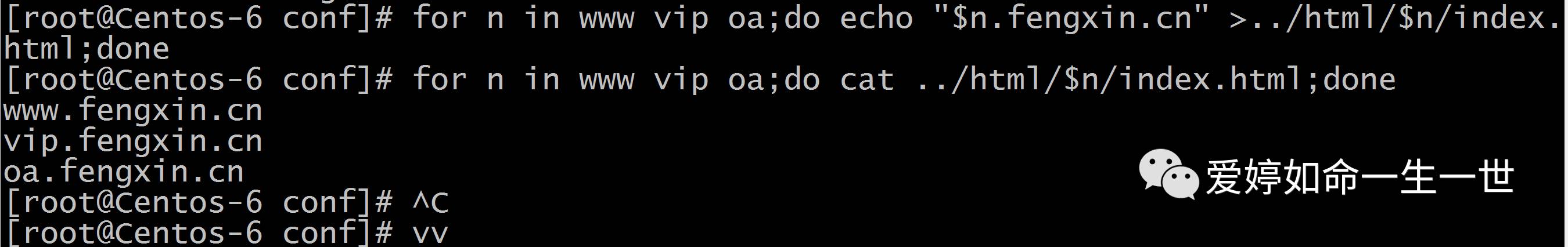 [root@Centos-6 conf]# for n in www vip oa;do echo "$n.fengxin.cn" >../html/$n/index.html;done