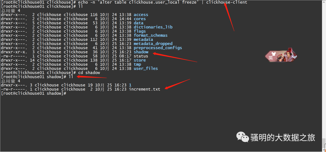 sudo echo -n 'alter table clickhouse.user_local freeze' | clickhouse-client记住这个的话最好是把数据库的名称也给加上,冻结之后的数据,也能使用的