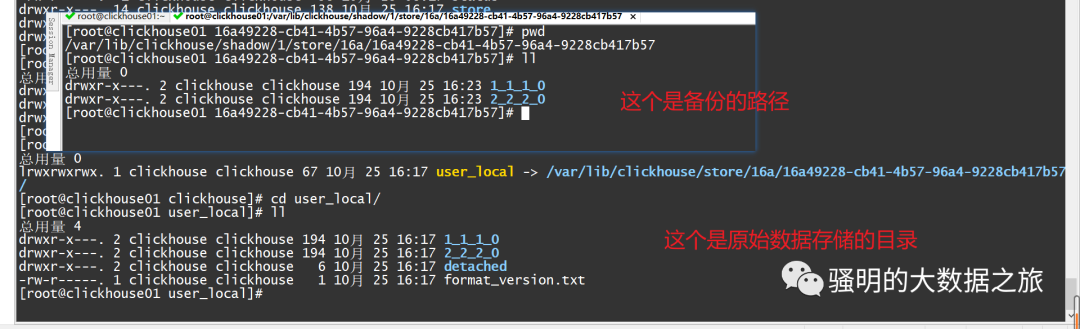 注意:在冻结、拷贝的过程当中,特别是到创建表的depatched目录下面一定要是clickhouse所属权限,否则的话会出现问题