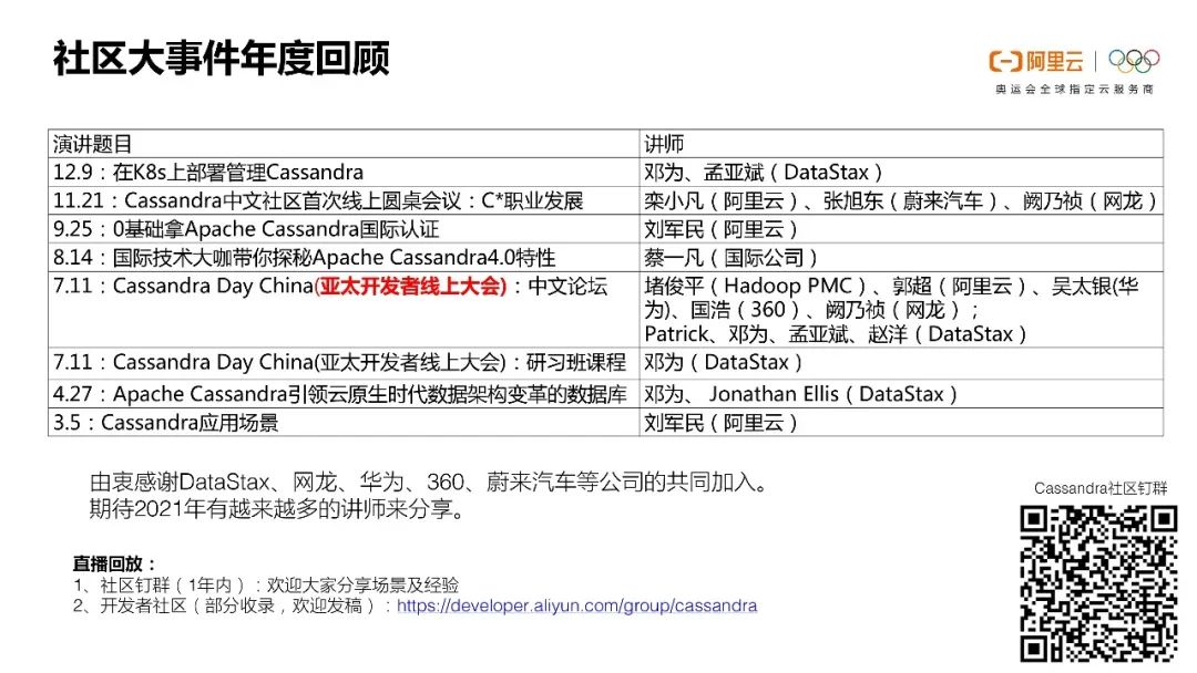 我今天会首先对社区2020年大事件进行回顾,其次会讲一下阿里云客户中典型的应用场景。我们在和客户的交流中,发现很多开发者,甚至CTO都不是很了解Cassandra。不知道Cassandra能应用在什么场景,所以我今天针对这个做一个专门的分享。