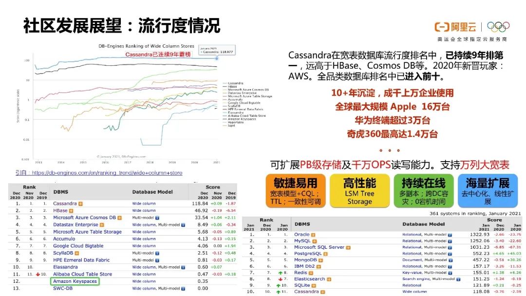 接下来是展望,其实Cassandra在宽表数据库领域其实已经连续9年霸榜了。大家可以看到这个数据库本身是一个非常好的非常优秀的数据库产品,它从2012年开始到现在流行一直都是第一的。所以大家可以看到它在国际上的地位,它其实是非常流行的一个数据库。
