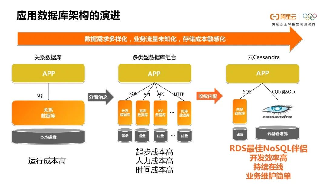 随着技术的发展,其实越到后面你就会发现除了要一个RDS之外,还需要一个NoSQL的大数据的数据库。我们Cassandra就是为了这种场景而诞生的。