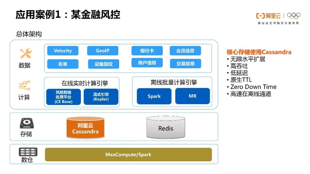 接下来就是一些具体的场景了,比如说金融风控和Spark的联合应用。比如说可以通过spark分析Cassandra里面的数据,然后做一些离/在线分析。类似于这种应用其实可以用到一些分工的场景。