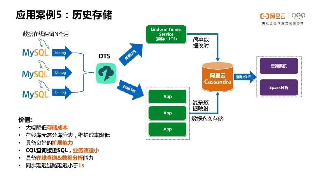 还有用户会把Cassandra用于历史存储。比如说我有一些其它系统的日志,我就可以把它们存到Cassandra里做一个长期归档。然后这些大量的数据还可以用来和spark做分析,然后可以提供报表或者是数据挖掘的能力。