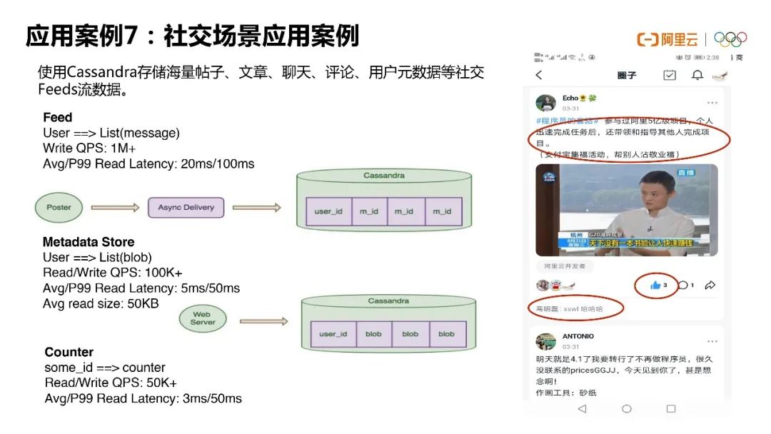 第七个场景就是社交场景。我们现在国内的APP越来越多,大家可能在国内是非常有体感的,各种各样的APP。它们其实都有这种类似于海量的帖子、文章、聊天,包括一些评论点赞。这些信息其实都可以用Cassandra就去做一个完美的实现。