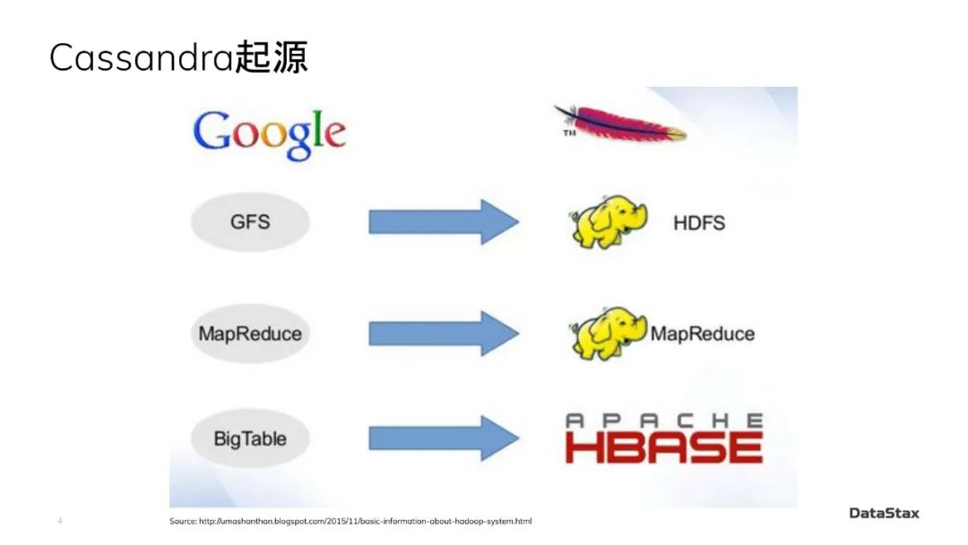 在大数据发展史上,还有一篇影响力几乎等同于谷歌“三驾马车”的论文。它就是亚马逊发布的Dynamo论文。右边下面列出来的概念,cluster peer-to-peer architecture, partitioning, replication, gossip, anti-entropy, hints对Cassandra运维比较熟悉的同学可能也是耳熟能详。