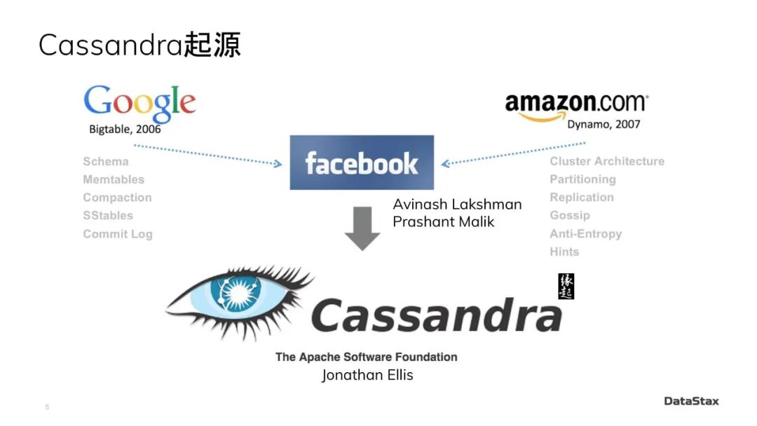 这张图里,只保留了Google BigTable放在左边,因为它仍然是我们这第一个故事的主角之一。如果熟悉Cassandra的同学,可能一眼就看出来了,左边它下面列出来的这些概念都是Cassandra里熟悉得不能再熟悉的东西了。Schema、Memtable、Compaction(也就是压实操作)、SSTable、Commitlog,等等。