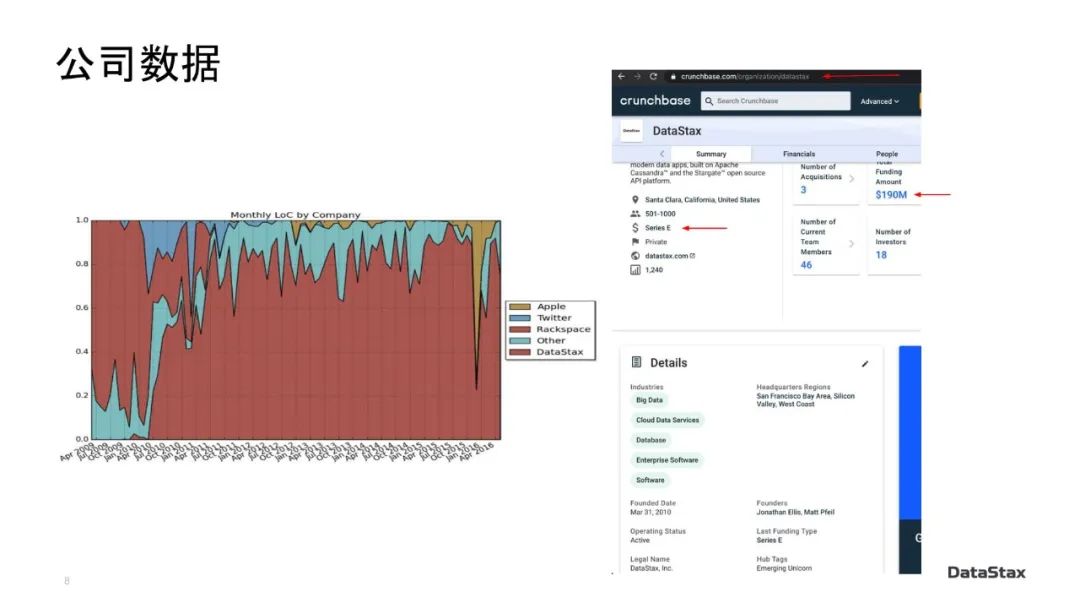 前面“公司数据”那张ppt中的左图,是2016年时有人在github的Apache Cassandra repository上根据提交人的公司归属做的一个统计。你在这里可以看到DataStax、苹果、推特、Rackspace的雇员贡献了大多数代码提交,但是DataStax员工的贡献(以红色标记)占据了最大的比例。超过85%的代码提交是由DataStax员工完成的。