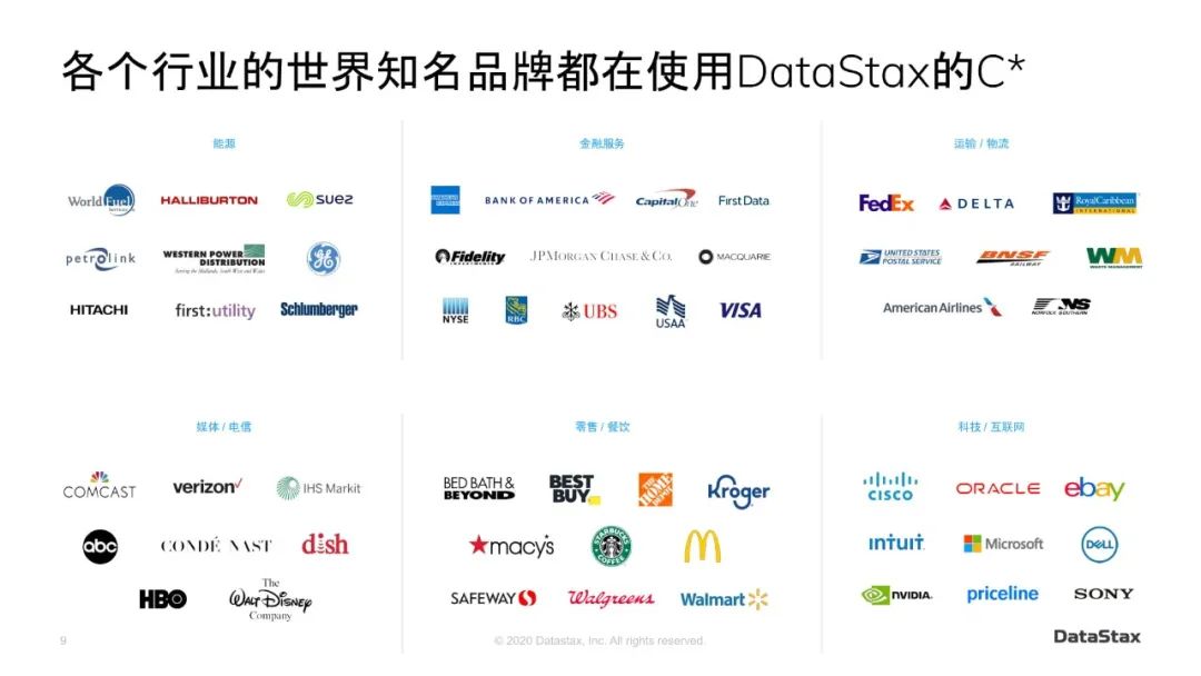 DataStax提供的企业版的Cassandra其实在全世界很多知名品牌都在使用,设计了很多不同的行业,包括:能源、金融服务、运输/物流、媒体/电信、零售/餐饮、科技/互联网,等等。这里面有很多财富前100强的跨国大公司。Cassandra数据库的不少优秀特质使得这些世界知名品牌都把Cassandra使用在最关键的生产环境中。