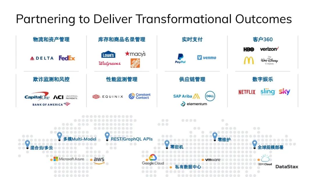这张幻灯片里是DataStax的大客户里使用Cassandra比较典型的一些应用场景:物流和资产管理、库存和商品名录管理、实时支付、客户360、欺诈监测和风控、性能监测管理、供应链管理、数字娱乐。这里有很多在中国的朋友也耳熟能详的品牌,比如联邦快递、梅西百货、麦当劳、迪士尼、美洲银行、戴尔、网飞 等等。
