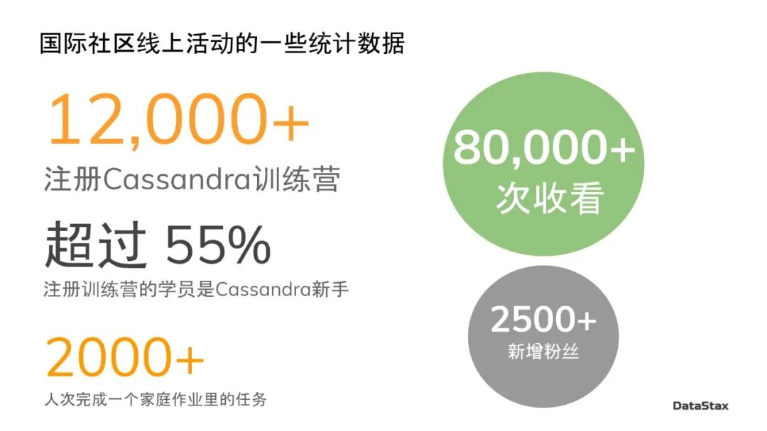 另外,除了刚刚讲的这些对Cassandra已经非常精通的个人和公司给社区带来的活力和贡献,另一方面,不断的拓展Cassandra在整个世界的开发者群体中的知名度和影响力,让更多的人知道Cassandra,新手能够学到最新的Cassandra的知识,也是DataStax去年的一个着重发力的方向。